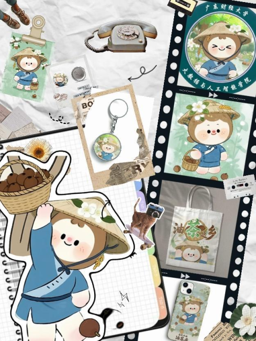 为让这份来自黄陂深山的 “绿色馈赠” 走得更远,广东财经大学穗智兴农实践团以文化创意为笔,为黄陂油茶量身打造了专属文创 IP 形象 ——“茶墩墩” 与 “茶芊芊”。这对形象以饱满圆润的油茶果为原型,头部造型取自油茶果纵向剖面,巧妙融入客家蓝布衫、竹编斗笠、油茶花等文化符号。“茶芊芊” 簪戴油茶花、手提客家竹编篓,象征油茶果的孕育与收获;“茶墩墩” 身着客家蓝布衫、头戴竹编斗笠,传递着丰收喜悦。以 “客家蓝”“茶花粉”“稻穗金” 为色调,既承载着黄陂油茶的地域特质,也让 “油茶之乡” 文化变得鲜活可感。目前,围绕这对 IP 开发的表情包、帆布袋、钥匙扣等文创产品,已成为黄陂油茶走向外界的 “移动名片”,让千年茶韵在青春创意中熠熠生辉。