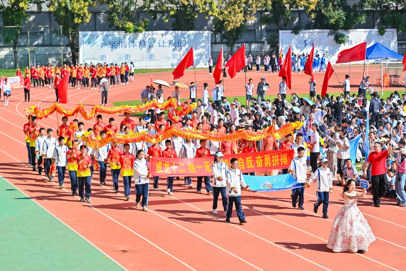 入场式上,整齐的队伍中,712 班的方阵格外引人注目。前方,清秀的女生稳稳举着班级牌匾引路,仿佛在为班级指引前行的方向。而后,两名同学抬着一条长长的注着“成龙十二 独一无二 超越自我 奋勇拼搏”字样的红色横幅,这不仅是班级的口号,更是同学们的信念与追求。班主任李格帆老师高举着火炬,在方阵侧面一同入场,那跳跃的火苗,如同智慧与勇气的火种,点燃了同学们心中的激情。今天,我们以火为魂,以龙为志,汇聚在这片赛场。火焰与巨龙交织成一幅壮丽的画卷——文明因火而兴,民族因龙而强!让我们以炽热的激情与昂扬的斗志,迎接挑战,书写属于我们成龙 12 班的辉煌篇章!横幅后方,两排男生身着统一舞龙服,托着两条“中国龙”同步舞动,似两条巨龙在云雾中穿梭,气势磅礴。队伍中间,几名同学高举龙纹令旗,旗帜在风中猎猎作响,仿佛在为巨龙指引方向。七名女生身着飘逸素雅的汉服站在侧旁,持彩扇跟着节拍轻舞,那优美的舞姿,宛如仙子下凡,为整个方阵增添了一抹灵动的色彩。队伍中,几位同学手持泡泡枪,轻按之下,泡泡悠悠升空,于阳光中折射出五彩华光,将方阵里蜿蜒的“龙”映衬得鲜活梦幻。