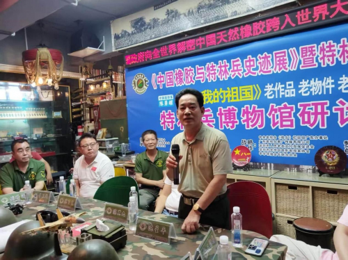 特林兵博物馆馆长陈勇耀为各位嘉宾讲解了特林兵博物馆的创办历史,介绍了中国人民解放军特种林业部队在毛主席、周总理正确领导和叶剑英元帅的率领下,打破美帝以及西方国家的封锁,秘密垦殖三十多年,成功在北纬18度以北地区大范围种植橡胶,中国橡胶从弱到强,已经跃居世界橡胶大国的生动故事。陈馆长对各位嘉宾的到来表示热烈欢迎和由衷地感谢!