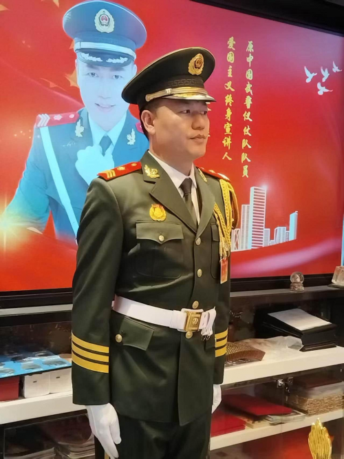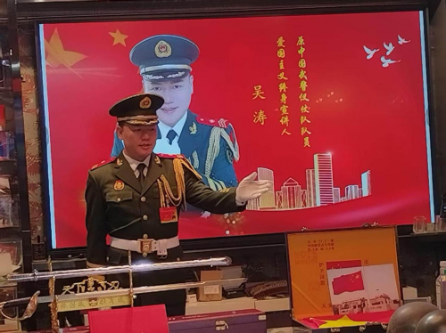 原中国武警仪仗队队员、爱国主义终身宣讲员吴涛带来了天安门《国旗》和仪仗队军刀,并身着庄严的仪仗礼宾服为与会嘉宾讲解了《国旗》的基本常识和爱护国旗的重要意义。