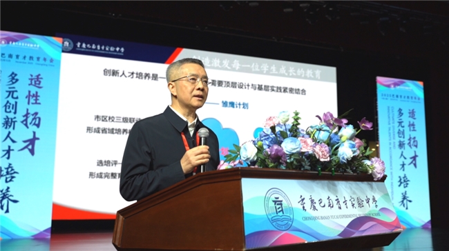 重庆市教育科学研究院院长蔡其勇作《多元创新人才培养探索,助力教育强国建设》主旨报告。他介绍了重庆市通过系统化推进拔尖创新人才培养体系建设,形成了以“雏鹰计划”为载体的特色路径,构建了科学培养模式。他高度评价重庆巴南育才实验中学与高校共建,深度贯通融合的创新实践,多元评价体系和依托创新工坊等平台,形成的“内外联动”创新教育新生态。