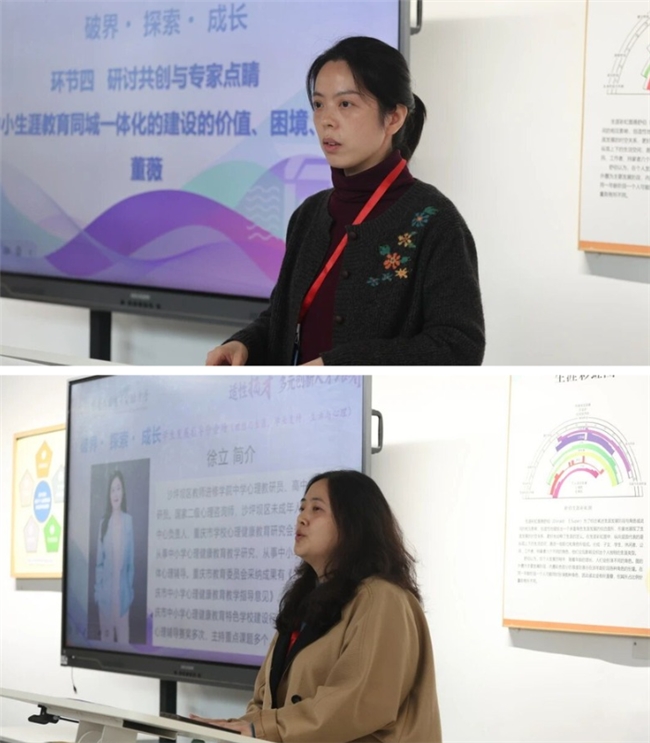 沙坪坝区教师进修学院中学心理健康教育教研院徐立老师分析心理健康教育前沿趋势;重庆师范大学学生生涯发展中心董薇老师给出大中小学段生涯教育一体化建设方案。