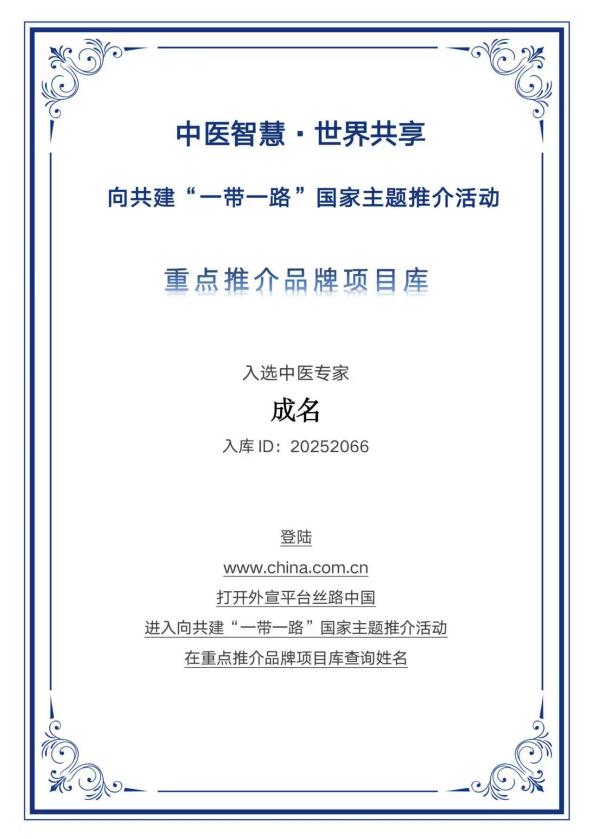 作为俄罗斯传统东方医学专家学会专家委员,他积极推动中医药国际化交流,其事迹曾在美国纽约时代广场纳斯达克大屏幕展播,成为世界优秀中医传承人。在他看来,中医药是中华民族的瑰宝,更是全人类的共同财富,基层中医药是中医药国际化的根基,唯有让中医药在基层落地生根、代代传承,才能让这门古老学问走向更广阔的世界,为全球健康事业贡献中国智慧。