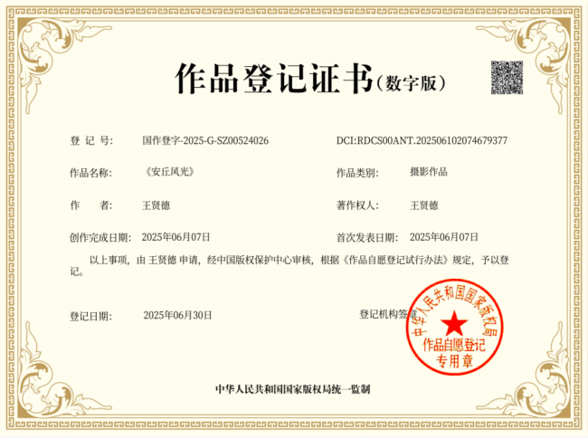 诸多国家级、国际级荣誉与资质,更是对他专业能力的认可。他身兼中国摄影著作权协会会员、山东省摄影家协会会员、安丘市摄影家协会副秘书长等职;2022年被推选为“文化中国 时代榜样”,获评全国第一批非物质文化遗产创新人才、献礼二十大文化传承代表人物;2023-2024年连续两年获评全国两会重点推荐艺术家,斩获联合国中文日国际文化大使、新时代摄影成就奖;2024年获评建国75周年文化发展模范人物;2025年,《安丘风光》系列获国家版权局版权登记,实现创作成果的法律认可;2026年春节,他作为摄影界唯一代表登上中国教育电视台丹青盛典晚会,让基层摄影艺术登上国家级文艺舞台。