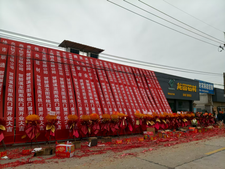 当清晨的阳光洒在常熟龙图铝材门店的灰色招牌上,醒目的黄色“龙图铝材”字样与“系统门窗批发”的标识格外亮眼。开业当天,门店前的空地上,数百条红色贺幅整齐排列,来自上海、苏州等地的合作企业与行业伙伴纷纷送来祝福。红底金字的条幅上,“贺碧溪龙图系统门窗开业大吉”的字样层层叠叠,与门前的鲜花拱门、满地的鞭炮碎屑相映成趣,将开业的喜庆氛围推向高潮。